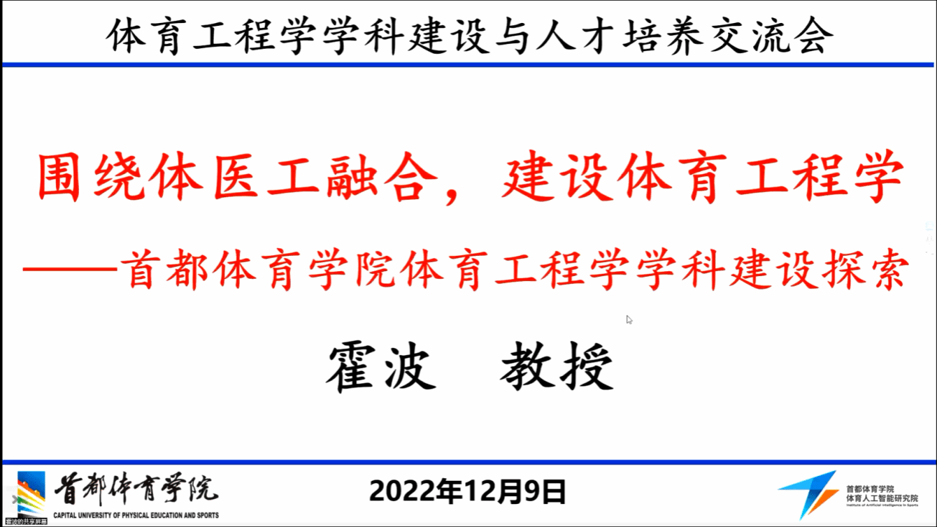 首都体育学院体育人工智能研究院院长霍波作“‘围绕体医工融合,建设体育工程学’——首都体育学院体育工程学学科建设探索”主题讲座。介绍首都体育学院如何围绕“体、医、工”进行融合,对体育工程学学科进行建设。