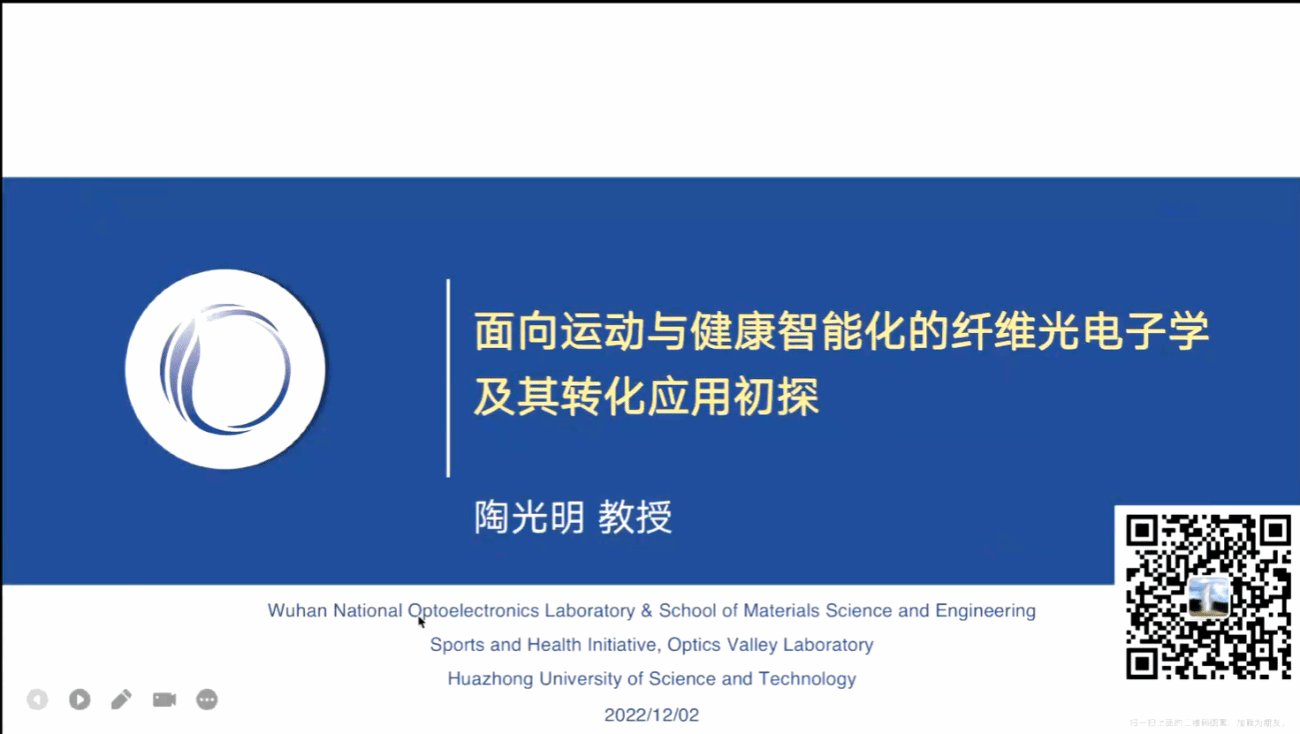 华中科技大学陶光明教授作“面向运动与健康智能化的纤维光电子学及其转化应用初探”主题讲座。分享光谷实验室运动健康智能化创业中心在面向运动与健康智能化领域,结合体育工程学做的初步探索与应用。