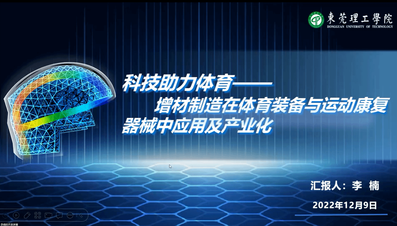 东莞理工学院李楠副教授作“科技助力体育--增材制造在体育装备与运动康复器械中应用及产业化”主题讲座。从科技服务竞技体育、医疗康复两个方面分享增材制造在体育装备与运动康复器械应用及产业化的案例。