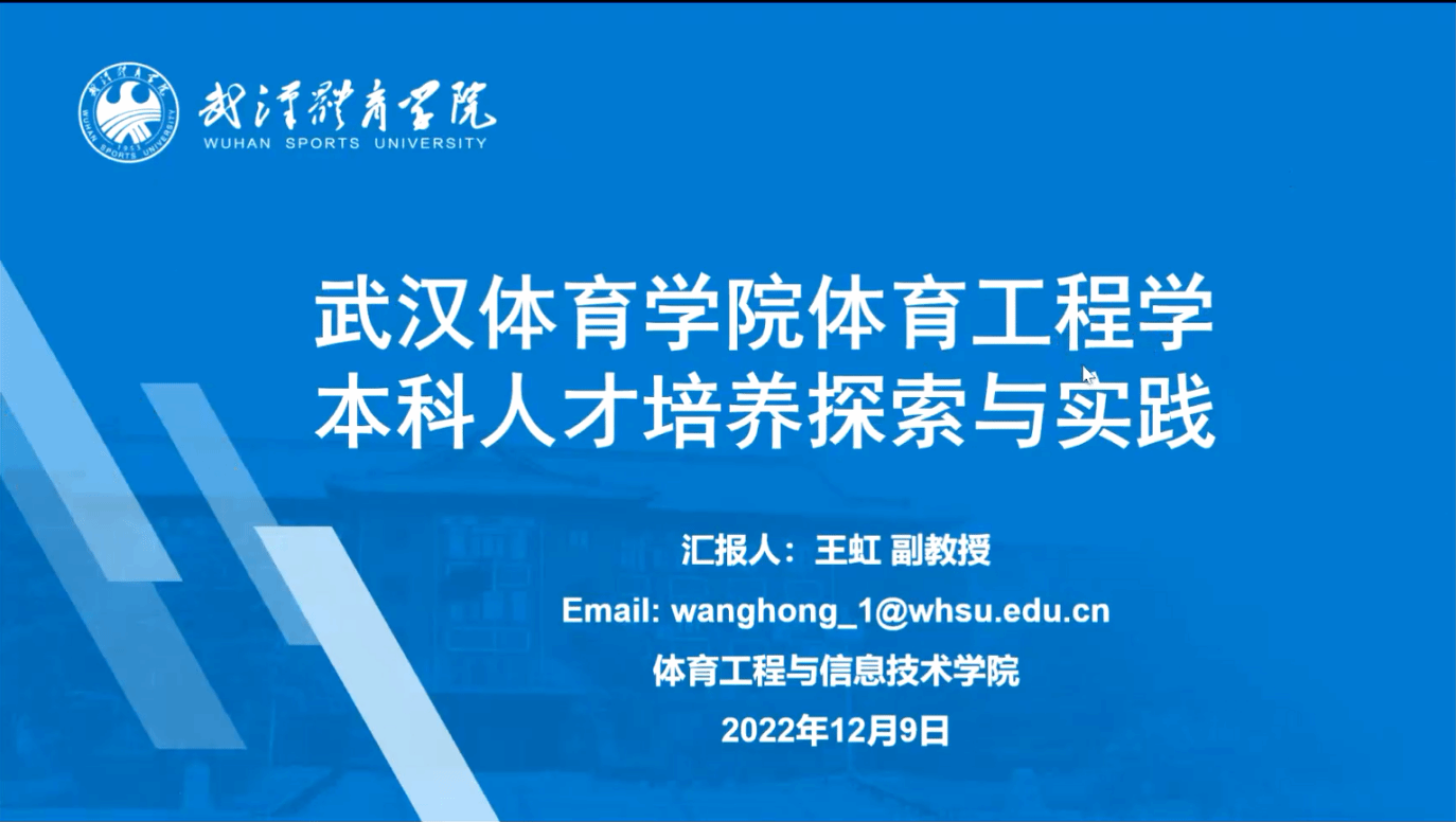 我校王虹副教授作“武汉体育学院体育工程学本科人才培养探索与实践”主题讲座,详细介绍了我校体育工程学本科人才培养发展史、培养方案、培养成效。同时提出我校体育工程学本科人才培养的困惑和展望。